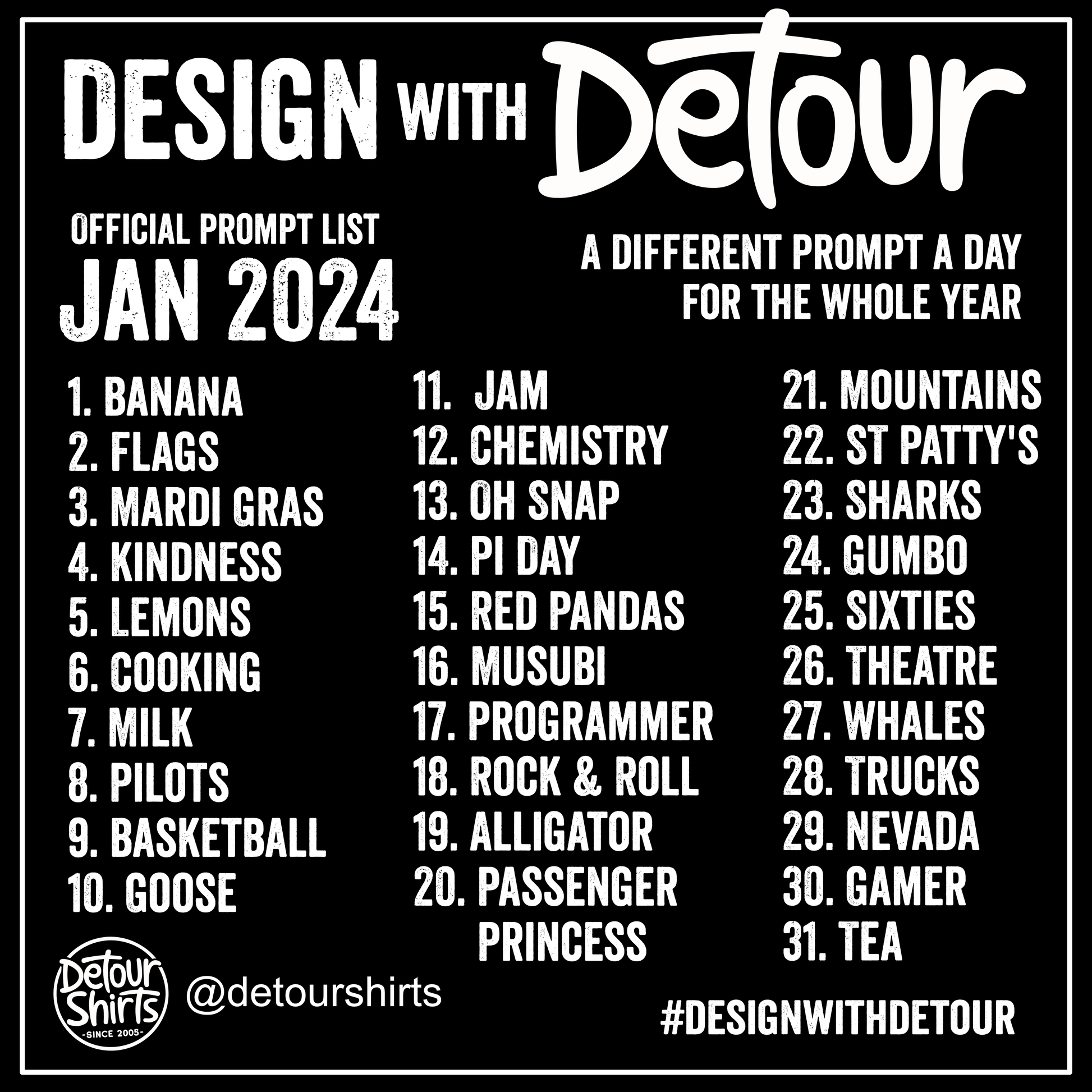 31 topics for the month of January. Use this list to create a design a day. It can be for t-shirts, stickers or any product you want. It could even be just for getting better at drawing. There will be a new prompt each month with new prompts. Share your work on Instagram with the hashtag #designwithdetour